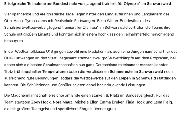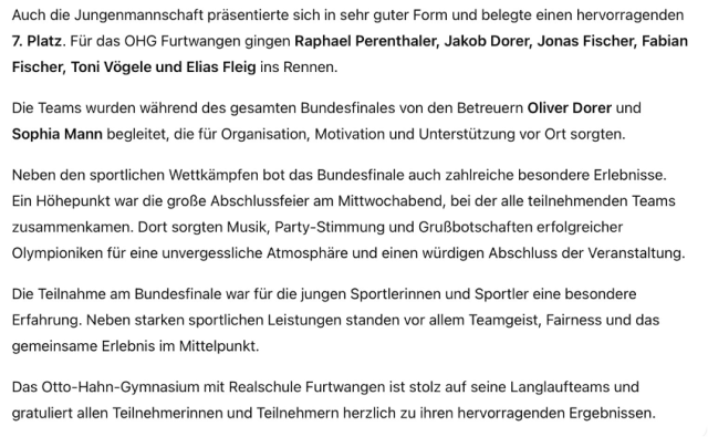 Erfolgreiche Teilnahme am Bundesfinale von "Jugend trainiert für Olympia" im Schwarzwald